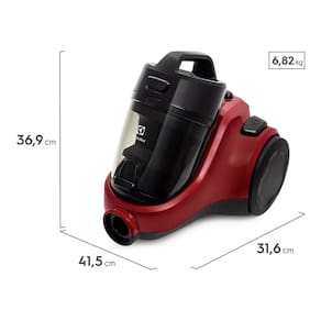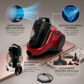 Aspirador de pó com alta potência e sistema de filtragem HEPA em quatro etapas. Tecnologia sem saco com reservatório de fácil esvaziamento. Controle de potência ajustável e design ergonômico com rodas emborrachadas.Tipo de coletor