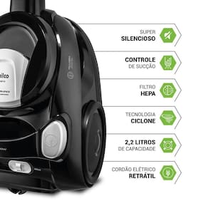 Aliado a 2,2L de capacidade, é possível limpar a casa toda sem precisar esvaziar o reservatório de pó com muita frequência.
