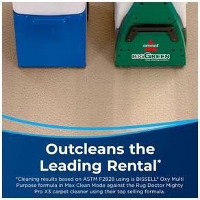 Resultados de Limpeza: Baseados na norma ASTM F2828 usando a fórmula BISSELL Oxy Multi Purpose contra o limpador de carpetes Rug Doctor Mighty Pro X3 usando sua fórmula mais vendida.