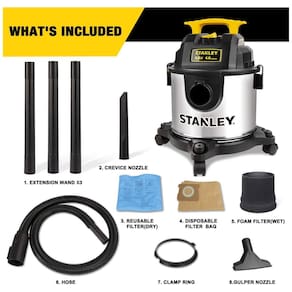 O design inteligente inclui armazenamento de acessórios integrado aos rodízios, mantendo todas as ferramentas essenciais sempre à mão. Com uma mangueira de 3,175 cm x 1,22 m e uma variedade de acessórios, como varas de extensão, bocal gulper, ferramenta para frestas e um saco de filtro descartável, este aspirador está equipado para lidar com qualquer desafio.