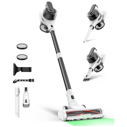 Deslize facilmente pelos cômodos com um aspirador de pó sem fio que é 30% mais leve que os modelos tradicionais. Ideal para uso diário, limpezas rápidas e alcançar locais altos ou estreitos com facilidade. Limpe mais, recarregue menos. Este aspirador recarregável oferece até 55 minutos de autonomia, o suficiente para cobrir até 139 metros quadrados de uma só vez. Perfeito para casas movimentadas e limpeza profunda em diferentes superfícies. Com potência de sucção de 20Kpa, ele remove sujeira, detritos e pelos de animais de estimação de carpetes e pisos de madeira. O design autônomo permite que você pause a limpeza a qualquer momento, enquanto a construção sem fio garante manobrabilidade. O rolo escovado atualizado combina cerdas rígidas e tiras de silicone para uma limpeza completa. Um amplo feixe de luz verde ilumina a poeira embaixo dos móveis e nos cantos escuros para que nada escape da sua limpeza. Economize tempo e reduza o desperdício com um filtro HEPA lavável por até 180 dias e um recipiente de poeira de 1L que precisa ser esvaziado com menos frequência. O armazenamento na parede com carregamento embutido mantém este aspirador sem fio pronto para uso.