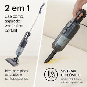 Características Gerais do produto Aspirador de pó vertical 2 emetros 1 cometros metrosotor de 1200W e sistemetrosa ciclônico. Possui filtro HEPA lavável e design leve e cometrospacto.