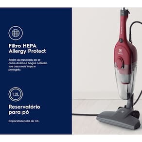 **Review: Aspirador de Pó Vertical com Fio Electrolux 1000W 2 em 1 PowerSpeed Filtro HEPA Vermelho (STK13A)**Experimente uma revolução na limpeza doméstica com o Aspirador de Pó Vertical STK13A PowerSpeed da Electrolux. Este elegante aparelho, equipado com 1000W de potência, é a escolha perfeita para quem busca praticidade, alto desempenho e versatilidade.1. **2 em 1 para Limpeza Prática:** - Este aspirador pode ser utilizado tanto verticalmente, para pisos, quanto como aspirador de mão, facilitando a limpeza de superfícies, móveis e bancos de carro.2. **1000W de Potência:** - Com alto poder de limpeza e eficiência energética, o STK13A garante resultados excepcionais em cada uso.3. **Filtro HEPA Allergy Protect:** - Proteja sua família retendo ácaros, fungos e bactérias, promovendo um ambiente mais seguro e puro.4. **Reservatório para Pó de 1.2L:** - O amplo reservatório garante autonomia e praticidade, reduzindo a frequência de esvaziamento.5. **Cabo Elétrico de 5 Metros:** - Aspire mais áreas sem preocupações. O cabo elétrico longo de 5 metros oferece praticidade e alcance.6. **Suporte para Cabo Elétrico:** - Maior organização e segurança. O suporte integrado evita fios jogados pela casa.7. **Estacionamento Vertical:** - Deixe seu aspirador em pé enquanto realiza outras atividades, otimizando espaço e armazenamento.8. **Bocal 180° e para Cantos e Frestas:** - Liberdade de movimento para limpeza eficiente em todos os cantos da casa.9. **Unidade de Mão Fácil de Usar:** - Transição suave entre modos. Basta retirar da unidade vertical para uma versátil unidade de mão.**Perguntas Frequentes (FAQ)**1. **Posso utilizar o aspirador em tapetes e carpetes?** - Sim, o STK13A é eficaz na limpeza de diversos tipos de superfícies, incluindo tapetes e carpetes.2. **O filtro HEPA precisa ser substituído regularmente?** - Recomenda-se verificar o manual, mas em geral, pode ser lavado conforme necessário para manter sua eficiência.3. **O cabo elétrico pode ser substituído?** - Em caso de danos, recomendamos entrar em contato com a assistência técnica autorizada.4. **O aspirador é adequado para pelo de animais de estimação?** - Sim, o alto poder de sucção torna-o eficaz na remoção de pelos de animais.5. **É possível adquirir acessórios adicionais para o aspirador?** - No momento, não oferecemos acessórios adicionais para este modelo.**Avaliações Positivas de Clientes**1. **Nome:** Isabela C. - **Avaliação:** "Superou minhas expectativas! O filtro HEPA faz toda a diferença na qualidade do ar. Recomendo!"2. **Nome:** Lucas M. - **Avaliação:** "Prático e eficiente. O cabo elétrico longo é um diferencial para a limpeza sem interrupções."3. **Nome:** Carla S. - **Avaliação:** "O design 2 em 1 é genial! Facilita muito na hora de limpar cantos e móveis."4. **Nome:** Rafaela P. - **Avaliação:** "Excelente poder de sucção. O reservatório de 1.2L é perfeito para uma limpeza completa."5. **Nome:** João R. - **Avaliação:** "Estou impressionado com a versatilidade e eficácia deste aspirador. Uma compra que valeu a pena!"**Ficha Técnica**- **Medidas do Produto:** - Altura: 104,6 cm - Largura: 25,5 cm - Profundidade: 17,1 cm - Peso: 2,0 kg (STK13A)- **Especificações:** - Tensão Elétrica (V): 127V ou 220V - Ajuste de Potência: Não - À Bateria: Não - Cor: Vermelho - Potência (W): 1000W - Tipo de Aspirador: Vertical - Enrolador de Cabo Elétrico: Manual - Consumo de Energia (kW/h): 1,0kW/h - Tipo de Filtragem: HEPA Allergy Protect - Acessórios Inclusos: Bocal para pisos 180° e bocal para cantos e frestas - Compartimento de Acessórios: Não - Capacidade Total do Reservatório (L): 1,2L - Reservatório Transparente: Sim - Velocidades: 1 - Unidade de Mão (2 em 1): Sim - Suporte para Cabo Elétrico no Corpo do Produto: Sim - Protetor Térmico: Sim - Tecnologia Bagless: Sim - Recurso Extra: Estacionamento Vertical- **Especificações Técnicas:** - Modelo: STK13A - Frequência: 50-60Hz - Largura do Produto na embalagem: 18 cm - Altura do Produto: 104,6 cm - Peso do Produto na embalagem: 2,3 kg - Largura do Produto: 25,5 cm - Profundidade do Produto na embalagem: 53,5 cm - Profundidade do Produto: 17,1 cm - EAN - 110V: 7896347181556 - Peso do Produto: 2,0 kg - EAN - 220V: 7896347181563 - Largura (Caixa Master): 55 cm - Altura do Produto na embalagem: 15,5 cm - EAN-14: 17896347181553 (127V) - 17896347181560 (220V) - Comprimento do Cabo Elétrico (m): 5 m