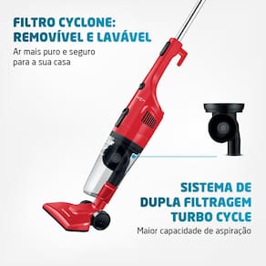 O filtro Cyclone é removível e lavável, ou seja, é mais prático e fácil de limpar, além disso, por não precisar de saco coletor, o aspirador é mais econômico e sustentável.