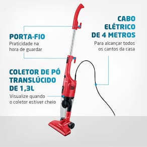 Possui coletor de pó translúcido com capacidade para 1,3 litros, que facilita muito para ver quando está cheio.