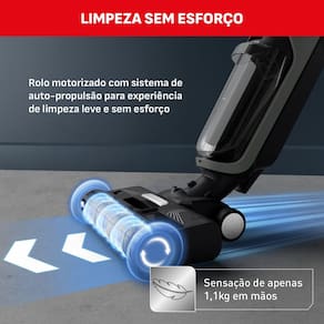 O conforto é um diferencial absoluto: graças à tecnologia de autopropulsão, o aparelho se movimenta quase sozinho, deixando uma sensação de apenas 1,1 kg nas mãos. Ao finalizar a tarefa, basta um toque no botão de autolimpeza para que o rolo seja higienizado automaticamente na base, evitando qualquer contato manual com a sujeira.