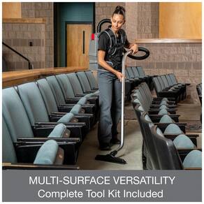 Inclui ferramentas versáteis como haste ajustável, ferramenta de fenda, escova para estofados, escova para poeira, bico para pisos rígidos e bico para carpetes, todas com diâmetro de 38 mm para alcance em áreas elevadas, escadas e superfícies variadas. Estrutura portátil em formato backpack facilita mobilidade em hotéis, escolas e espaços comerciais, com capacidade de 3,8 L no saco descartável para minimizar interrupções.