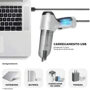 Função soprador, Sucção forte, Absorve cabelos, resíduos de comida, partículas e detritos menores que 0,1 mícron, Ideal para limpeza rápida diária, limpeza de automóveis e doméstica, Acessórios multifuncionais, Limpa todos os cantos, Sem fio, Leve, Fácil de transportar, Recarregável via USB (laptop, PC, banco de energia, carregador), Tensão de entrada: DC 3,7V, Material: Plástico, Sucção de vácuo: 9000Pa, Tamanho: 16,5x14,5x4cm, Capacidade da bateria: 2500mAh, Tempo de trabalho: 20 a 35min, Tempo de carregamento: 4 horas, Capacidade de poeira: 90mlTipo de coletor