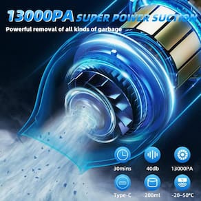 - ?Sucção forte 22000PA?O aspirador de pó para carro adota tecnologia de motor sem escova, que pode efetivamente reduzir o desgaste e prolongar a vida útil do aspirador de pó de carro em comparação com motores escovados comuns. O modo de sucção padrão de 13000PA é adequado para limpeza diária e o modo máximo de sucção é de até 22000A, o que é adequado para limpeza profunda.