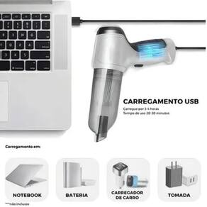 Este aspirador de pó é sem fio, leve e fácil de transportar. Ajuda a limpar escadas, cozinhas, pisos, carpetes, carros e locais de difícil acesso. É recarregável via USB, podendo ser carregado por laptop / PC / banco de energia / carregador com porta USB.