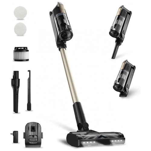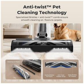 Escova V com rolos de diferentes durezas e lâminas removedoras previne emaranhados, com inclinação plana de 180° para acesso sob móveis. Filtragem HEPA de 6 estágios captura 99,97% de partículas de 0,3 mícron, com componentes removíveis (escova, filtros, copo) para manutenção simples. Estrutura 2-em-1 converte para handheld com 4 rodas para manobras suaves e suporte de carregamento.
