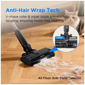 O Candy HF1 Plus utiliza motor brushless de alta eficiência com dois modos de sucção para remoção de pelos, detritos em carpetes, pisos rígidos, azulejos e estofados. Autonomia de 45 minutos por carga suporta limpeza contínua, com bateria removível para recarga independente e estrutura 2-em-1 que converte para portátil em segundos. Escova V anti-emaranhado previne acúmulo de fios, com rotação de 270° e inclinação plana de 180° para acesso sob móveis e cantos.