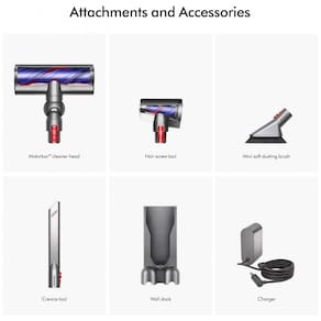 • Conteúdo da caixa: aspirador Dyson V8 Plus, suporte de parede, carregador, escova mini para poeira macia, cabeça Motorbar, ferramenta de fendas, ferramenta Hair Screw, bateria de íons de lítio (1).?