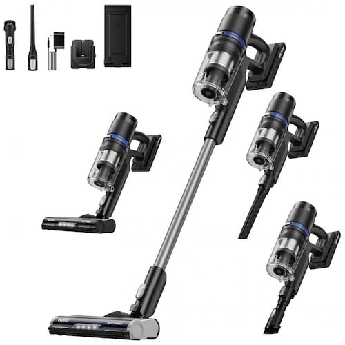 Oferece autonomia de 60 minutos em 3 modos de potência (baixo, auto, alto) controlados por botões no punho, convertendo de stick upright para handheld com acessórios como bico fenda e escova para poeira. A bateria destacável permite recarga independente, com filtro lavável para manutenção simples. Projetado para uso indoor portátil em aspiradores stick Eureka NEC451BL com voltagem de 25,9 Volts.