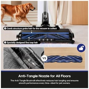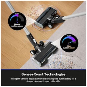 O Aspirador Sem Fio Eureka NEC451BL utiliza tecnologia Smart Sense+React para monitoramento em tempo real da concentração de poeira, ajustando automaticamente sucção e velocidade do rolo de escova em superfícies como pisos duros, carpetes e azulejos. O bico anti-emaranhado com aletas especiais e tiras de pentes densos guia fios e cabelos em tempo real, mantendo o rolo desobstruído para sucção constante de 350 W. O filtro HEPA H13 captura 99,95% de micropartículas com sistema selado que evita vazamentos de poeira.