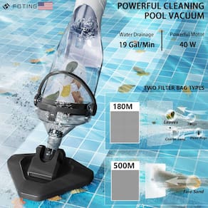 Descubra um aspirador portátil de piscina, um poderoso limpador de 40 W com uma taxa de fluxo máxima de 40 litros por minuto, perfeito para coletar rapidamente detritos como folhas, sujeira e areia (não para algas). Com cabeças de escova removíveis para fácil instalação e remoção, limpa com precisão escadas, cantos e áreas difíceis de alcançar. Com um mastro telescópico de alumínio estendido (91-222 cm), aproveite a limpeza sem fio dos pontos mais distantes. A operação é simples: fixe, ligue, submerja e limpe. A tela de filtro removível e a montagem sem ferramentas tornam a manutenção sem complicações. Inclui 4 bolsos de filtro, um cabo USB e um poste telescópico. 5 baterias recarregáveis de 2000 mAh oferecem 60 minutos de limpeza e recarga em apenas 1,5 hora. Apoiado por 100% testes do fabricante e uma garantia de três anos, o aspirador de piscina FOTING é sua escolha confiável para manutenção eficiente da piscina. - ?Sucção potente de 19 GPM?O aspirador de piscina portátil FOTING possui um motor potente de 40 W com uma taxa de fluxo de 19 galões/min, limpa piscinas sem esforço ou realiza limpeza pontual em segundos. Remove efetivamente detritos como bolotas, galhos, folhas, sujeira e areia (não é adequado para algas) - ?Cabeças removíveis?O aspirador de piscina sem fio FOTING possui cabeças de escova de fixação rápida para limpeza precisa de escadas, cantos e pontos difíceis de alcançar. Sua escova triangular limpa sem esforço piscinas, spas, banheiras de hidromassagem e muito mais - ?Pólo telescópico estendido?O aspirador de hidromassagem oferece 2 métodos de limpeza (mastro portátil ou telescópico) com um interior ondulado reforçado e poste de alumínio ajustável (91 a 222 cm), alcançando espaços apertados sem esforço através do design sem fio - Fácil operação e manutenção: o aspirador de piscina FOTING funciona simplesmente: prenda a uma alça, atire, submerja a tomada e limpe (temperatura máxima da água 35 °C). Possui um conjunto sem ferramentas, tela de filtro removível e inclui 4 bolsos de filtro, cabo USB, poste de alumínio telescópico e embalagem colorida - ?Tempo de funcionamento de 60 minutos e carregamento rápido?O aspirador de piscina sem fio FOTING proporciona tempo de funcionamento de 60 minutos com 5 pilhas de 2000 mAh e recarga rápida de 1,5 hora, garantindo uma limpeza ininterrupta. 100% testado pelo fabricante. Serviço pós-venda de três anos, a tempo se houver algum problema