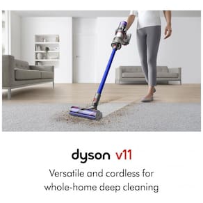 O aspirador vertical sem fio Dyson V11 foi projetado para limpeza completa de todos os tipos de piso em ambientes internos, com 3 modos de potência (Eco, Auto, Boost) e tela LCD que exibe modo atual, alertas de manutenção e tempo restante. Inclui cabeça Motorbar que limpa carpetes e pisos duros, removendo fios e pelos longos automaticamente, além de conversão para aspirador de mão para estofados, escadas e veículos. Opera com bateria de íons de lítio por até 60 minutos, sistema bagless e filtro lavável tipo disco.