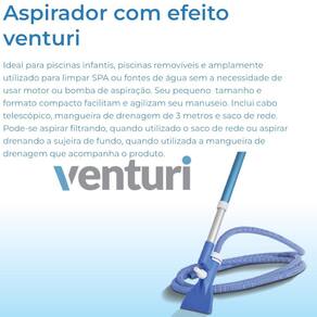 Aspirador com efeito venturi Ideal para piscinas infantis, piscinas removíveis e amplamente utilizado para limpar SPA ou fontes de água sem a necessidade de usar motor ou bomba de aspiração. Seu pequeno tamanho e formato compacto facilitam e agilizam seu manuseio. Inclui cabo telescópico, mangueira de drenagem de 3 metros e saco de rede. Pode-se aspirar filtrando, quando utilizado o saco de rede ou aspirar Drenando a sujeira de fundo, quando utilizada a mangueira de drenagem que acompanha o produto.