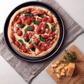 Com a assadeira para pizza Tramontina Brasil em alumínio com revestimento interno e externo antiaderente Starflon Max grafite 30 centímetros de diâmetro 1,8 litros as reuniões entre amigos serão regadas de muita pizza.