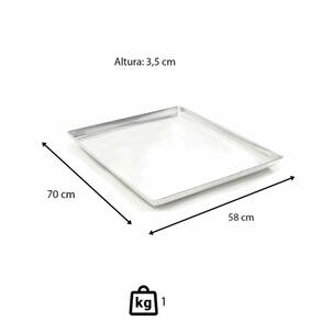 A Assadeira Imeca possui 58x70x3,5 cm, oferecendo um tamanho generoso ideal para assar pães, bolos, assados e muito mais.