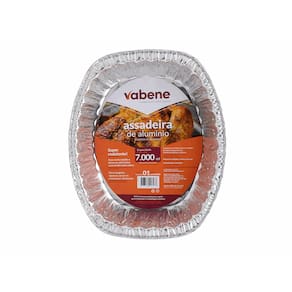 Assadeira descartável de alumínio na forma oval, utilizada para acondicionamento e embalagem de alimentos, de espessura de 0,108 mm e capacidade de 7000ml. sem suporte, não gravadas