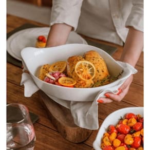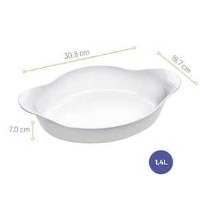 Assadeira Travessa Grande de Vidro Temperado 1,4L Opaline Marinex Branca #Travessa Marinex branca #Linha Opaline Marinex #Design e praticidade Garantia: 90 dias / Peso: 718g / Cor: Branco / Ref: 7891155072706 Dimensões externa superior: 30cm (C) x 20cm (L) x 7cm (A) Dimensões interna superior: 26cm (C) X 18cm (L) Dimensões externa inferior: 22cm (C) x 16cm (L) x 7cm (A) Dimensões interna inferior: 20cm (C) x 15cm (L) x 6cm (A) Dimensão alça: 6cm (C) X 2cm (L) Espessura: 0,5cm Formato: Oval. Capacidade: 1,4 litros Conteúdo: 01 Assadeira Grande. Limpeza e Cuidados: - Lavar com água e sabão neutro utilizando esponja macia, seguido de pano seco; - Não utilizar produtos químicos ou abrasivos na limpeza; - Vai a lava-louças. Detalhes do Produto: - Não utilizar diretamente sobre a chama, aquecedor elétrico, chapa ou grelha; - Pode ser levado ao forno com temperatura máxima de +300°C; - Pode ser levado ao freezer com temperatura mínima de -20°C; - Pode ser levado ao micro-ondas por até 10 minutos; - Suporta choque térmico de até 180°C; - Produto não acompanha tampa; - Produto livre de BPA. Material: - Vidro Temperado: Alta resistência ao calor e a impactos. Não pega cheiro e não mancha. Atóxico, pode entrar em contato com alimentos. A travessa Marinex Opaline é produzida em vidro temperado branco, e serve desde o preparo inicial até o momento de servir. A travessa oval branca possui capacidade para 1,4 litros sendo ideal para servir suas receitas favoritas para sua família e amigos. A travessa branca Marinex dispõe de alças ergonômicas, oferecendo praticidade no momento de servir. Esta travessa branca grande é ideal para uso em forno convencional, micro-ondas, freezer, geladeira e lava-louça.