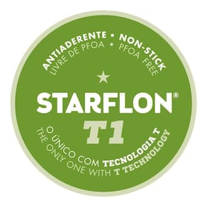Corpo de alumínio com espessura de 0,8 mm que proporciona cozimento rápido e uniforme. Revestimento interno e externo de antiaderente Starflon T1. O único com a tecnologia T: maior poder de antiaderência; maior resistência à abrasão; maior durabilidade; mais fácil para limpar e livre de PFOA, garantindo uma resistência à abrasão acima de 5.000 ciclos segundo a Norma ABNT NBR 15321:2013. Pode ir à máquina de lavar louças facilitando seu dia a dia.