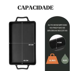 Material: Ferro fundido Medidas: 30 × 45 × 4,5 cm Capacidade: 4,2 litros Peso: 6,34 kg