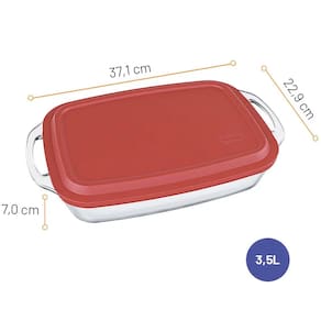Seu design retangular e generosa capacidade de 3,5 litros permitem assar grandes porções e gratinas de forma uniforme.