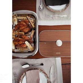 A assadeira em aço inox com tampa de vidro pode ir ao forno, podendo haver mudança na coloração.