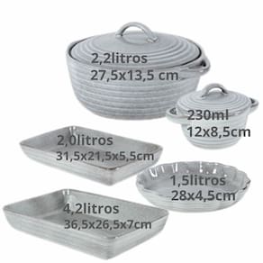 Assadeira Cinza Claro 36,5x26,5x7cm 4,2tsAssadeira Cinza Claro 31,5x21x5,5cm 2ltsAssadeira Redonda Cinza Claro D. 28,5X4,5cm 1,5ltsCaçarola Jade Cinza Claro D. 27,5x13,5cm 2,20litrosCacarolinha Jade Cinza Claro D.12x8,5cm 230mlRecomendações: