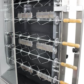 Através de um sistema eficaz de queimadores infravermelhos, o frango fica assado por igual, deixando o frango assado por igual. Por meio do isolamento térmico em lã de rocha, a temperatura se mantém alta com o mínimo de gasto de luz e gás. Graças ao seu acabamento externo em aço inox AISI 430, o equipamento tem alta resistência contra ferrugens geradas por gordura e água.