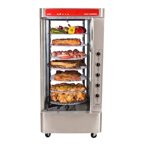 O Multi Grill Pro da Arke é a versão avançada do tradicional Multi Grill, com acendimento automático para maior comodidade e segurança no uso. Conta com 5 queimadores a gás e 7 grades rotativas, possibilitando o preparo de até 8 frangos por vez com distribuição uniforme de calor. Estrutura em aço inox escovado e interior esmaltado garantem resistência, fácil higienização e acabamento elegante. Comporta carnes variadas, como gado, ovelha, frango e porco. Ideal para estabelecimentos com alta demanda e produção constante.