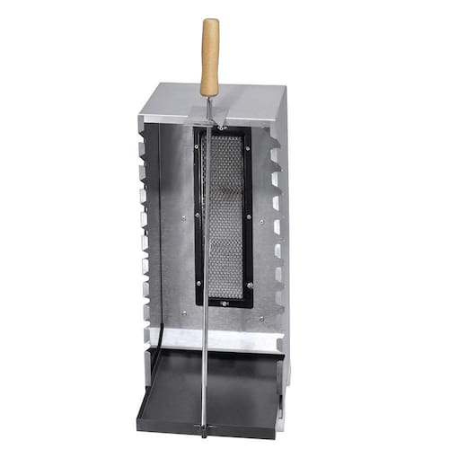 A linha de churrasqueiras Vertical é confeccionada em chapa aço inox 430. Esta churrasqueira apresenta infravermelho traseiro que é utilizado para assar as carnes sem o uso de carvão. O produto possui bandeja coletora de resíduos na parte inferior e lugar para 10 espetos verticais e 1 horizontal. Este produto é ideal para apartamentos e uso doméstico, não emite gases tóxicos e é muito prático. Produto a gás.