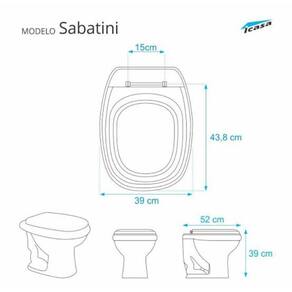ssento Sanitário Souza Flex para vaso Icasa Assento sanitário SABATINIi é a escolha perfeita para renovar seu banheiro com ainda mais beleza e praticidade. Assento sanitário Almofadado com perfeito acabamento. Fácil de instalar, já vem pronto e completo para encaixe no vaso sanitário. Especificações Modelo SABATINI Cor: branco Ferragem metálica em aço inox não oxida. Compatível com vasos com ou sem caixa acoplada. Medidas aproximadas do produto - Comprimento: 43 cm - Altura: 5 cm - Largura: 39 cm - Peso: 1,7 kg Marca: Não Informado