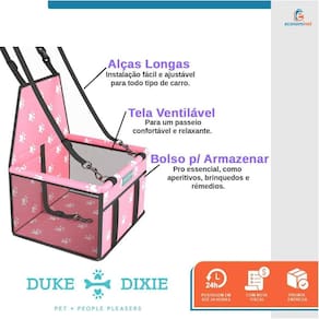 O assento para carro da Duke e Dixie é ideal para passeios, além de oferecer conforto e segurança para o seu pet. Produzido de acordo com as normas de trânsito para transportar animais em veículos, é adaptável com a maioria dos assentos dos automóveis que tenham encosto de cabeça. Confeccionado em material impermeável oxford em todo o assento e ganchos resistentes de fácil instalação garante segurança ao transportar seu pet. Possui tela arejada nas laterais para melhor ventilação. Acompanha fivelas ajustáveis para todo tipo de carro; e bolso com zíper para armazenagem de brinquedos, aperitivos, remédios e outros. - Adaptável a maioria dos assentos de automóveis;- Indicado ao transporte de cães e gatos de até 6kg;- Possui cinto de segurança acoplado a cadeira;- Fácil instalação, fixado no próprio cinto de segurança e banco do carro;- Proporciona ao seu pet um passeio agradável e aos donos um transporte mais seguro;- Protege o assento do automóvel de sujeiras;- Dobrável e fácil de transportar;- Altura regulável. INSTRUÇÕES DE USO:- Apoie a bolsa no assento do banco do carro;- Passe as alças de apoio por trás do encosto de cabeça do banco do carro e ajuste-as até ficarem esticadas;- Coloque o cinto de segurança por dentro dos passadores;- Coloque o pet dentro da bolsa, prendendo a guia fixa interna na coleira do animal. CARACTERÍSTICAS TÉCNICAS:Material: Tecido oxford, espuma e pvcMedidas: 45cm altura total x 34cm largura x 40cm comprimento x 25cm altura do cesto Indicação: Cão e gato de porte pequeno até 6kg Marca: Duke e DixieRef.: 1500503