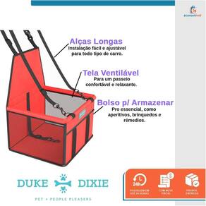 O assento para carro da Duke e Dixie é ideal para passeios, além de oferecer conforto e segurança para o seu pet. Produzido de acordo com as normas de trânsito para transportar animais em veículos, é adaptável com a maioria dos assentos dos automóveis que tenham encosto de cabeça.