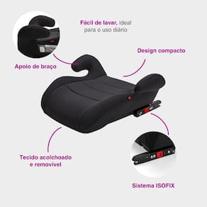 Recomendado para crianças a partir de (15 até 36kgs), possui estrutura resistente, é leve, de fácil instalação com sistema ISOFIX em apenas um clique o assento é instalado, coberto por tecido acolchoado para as crianças maiores passearem com segurança e conforto.