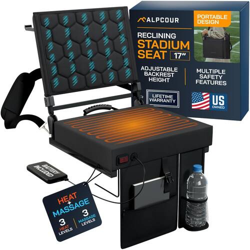- Portátil e leve – Pesando menos de 4,5 kg, esta cadeira de estádio aquecida inclui uma alça de transporte e alças de ombro para facilitar o transporte. Perfeito para piqueniques, eventos esportivos e aventuras ao ar livre.