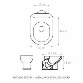 Assento Sanitário tampa de vaso fabricado em madeira MDF com pintura laqueada, com proteção raios UV, que garante excelente acabamento e durabilidade. Compatível com vasos bacias/louças sanitários com ou sem caixa acoplada. Tem calços de PVC instalados na tampa e no assento para proporcionar estabilidade ao uso, pois distribui o peso uniformemente sobre a louça sanitária. Montagem simples e fácil. Possui ferragem em alumínio anodizado que não enferruja/oxida e oferece muita resistência. O assento é acompanhado por parafusos para instalação. Embalagem dupla reforçada garante o recebimento do produto totalmente protegido. Especificações: - Dimensões da caixa: largura: 51,50cm. Altura: 4,00cm comprimento: 38,00cm - Peso do produto: 1,98kg - Acabamento: brilhante - Uso: este assento é adequado para uso na louça Ideal Standard modelo Ezedra - Garantia: 3 meses - Itens inclusos: Tampa e assento com calços de PVC, ferragem inoxidável, embalagem duplamente reforçada. Contém todos os parafusos e encaixes para instalação, sendo necessária somente uma chave de fenda para instalar o produto na louça sanitária. Instalação:posicione o produto, devidamente centralizado, em cima do vaso sanitário. Sem desmontar a ferragem, insira as buchas de borracha dentro dos furos da bacia sanitária. Utilizando uma chave de fenda, aperte o parafuso no sentido horário até que o assento esteja firme no vaso. Manutenção: recomendamos a limpeza periódica com pano levemente umedecido com sabão neutro. Não usar esponjas abrasivas ou palha de aço nem qualquer tipo de produto químico.