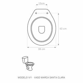 Assento Sanitário (tampa de vaso) fabricado em madeira MDF com pintura laqueada, com proteção raios UV, que garante excelente acabamento e durabilidade. Compatível com vasos (bacias/louças) sanitários com ou sem caixa acoplada. Tem calços de PVC instalados na tampa e no assento para proporcionar estabilidade ao uso, pois distribui o peso uniformemente sobre a louça sanitária. Montagem simples e fácil. Possui ferragem em alumínio anodizado que não enferruja/oxida e oferece muita resistência. O assento é acompanhado por parafusos para instalação. Embalagem dupla reforçada garante o recebimento do produto totalmente protegido. Especificações: - Dimensões da caixa: largura: 51,50cm. Altura: 4,00cm comprimento: 38,00cm - Peso do produto: 1,98kg - Acabamento: brilhante - Uso: este assento é adequado para uso na louça Santa Clara de modelo Ivy - Garantia: 3 meses - Itens inclusos: Tampa e assento com calços de PVC, ferragem inoxidável, embalagem duplamente reforçada. Contém todos os parafusos e encaixes para instalação, sendo necessária somente uma chave de fenda para instalar o produto na louça sanitária. Instalação: posicione o produto, devidamente centralizado, em cima do vaso sanitário. Sem desmontar a ferragem, insira as buchas de borracha dentro dos furos da bacia sanitária. Utilizando uma chave de fenda, aperte o parafuso no sentido horário até que o assento esteja firme no vaso. Manutenção: recomendamos a limpeza periódica com pano levemente umedecido com sabão neutro. Não usar esponjas abrasivas ou palha de aço nem qualquer tipo de produto químico. Marca: LOJAROCCA