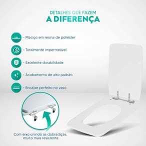 Limpeza: recomenda-se a limpeza do assento sanitário poliéster com água e sabão neutro, não utilizar produtos abrasivos.