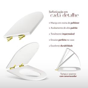 Maciço em resina de poliéster, é considerado o melhor material do mercado de assentos sanitários por ser totalmente impermeável, pelo seu acabamento impecável e excelente durabilidade. Possui exclusivo sistema de amortecedor soft close para fechamento suave da tampa e do assento, acompanhando as mais modernas tendências em decoração.