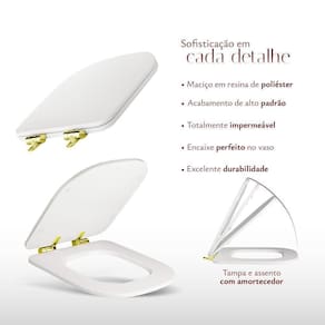 O destaque deste produto está em seu design de linhas retas, na qualidade de seus materiais e acabamentos modernos. A ferragem é em latão cromado na cor Dourada, o mais nobre e sofisticado para assentos sanitários.