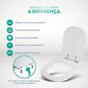 Limpeza: recomenda-se a limpeza do assento sanitário poliéster com água e sabão neutro, não utilizar produtos abrasivos.