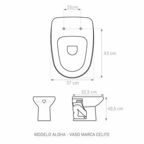 Assento Sanitário (tampa de vaso) fabricado em madeira MDF com pintura laqueada, com proteção raios UV, que garante excelente acabamento e durabilidade. Compatível com vasos (bacias/louças) sanitários com ou sem caixa acoplada. Tem calços de PVC instalados na tampa e no assento para proporcionar estabilidade ao uso, pois distribui o peso uniformemente sobre a louça sanitária. Montagem simples e fácil. Possui ferragem em alumínio anodizado que não enferruja/oxida e oferece muita resistência. O assento é acompanhado por parafusos para instalação. Embalagem dupla reforçada garante o recebimento do produto totalmente protegido. Especificações: - Dimensões da caixa: largura: 51,50cm. Altura: 4,00cm comprimento: 38,00cm - Peso do produto: 1,98kg - Acabamento: brilhante - Uso: este assento é adequado para uso na louça Celite modelo Aloha - Garantia: 3 meses - Itens inclusos: Tampa e assento em MDF com calços de PVC, ferragem inoxidável, embalagem duplamente reforçada. Contém todos os parafusos e encaixes para instalação, sendo necessária somente uma chave de fenda para instalar o produto na louça sanitária. Instalação: posicione o produto, devidamente centralizado, em cima do vaso sanitário. Sem desmontar a ferragem, insira as buchas de borracha dentro dos furos da bacia sanitária. Encaixe os parafusos e posicione as porcas. Utilizando uma chave de fenda, aperte o parafuso no sentido horário até que o assento esteja firme e fixo no vaso. Manutenção: recomendamos a limpeza periódica com pano levemente umedecido com sabão neutro. Não usar esponjas abrasivas ou palha de aço nem qualquer tipo de produto químico. Marca: LOJAROCCA