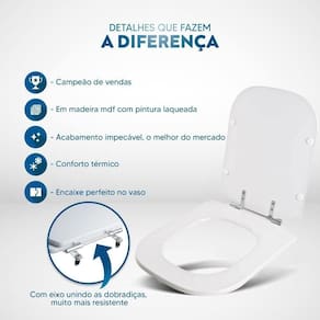Durabilidade e Resistência: Fabricado em MDF com camadas de pintura laqueada, este assento oferece não apenas beleza, mas também conforto térmico e alta resistência. Seu acabamento impecável adiciona um toque de classe ao seu banheiro.
