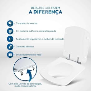 Durabilidade e Resistência: Fabricado em MDF com camadas de pintura laqueada, este assento oferece não apenas beleza, mas também conforto térmico e alta resistência. Seu acabamento impecável adiciona um toque de classe ao seu banheiro.