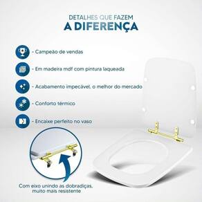 Durabilidade e Resistência: Fabricado em MDF com camadas de pintura laqueada, este assento oferece não apenas beleza, mas também conforto térmico e alta resistência. Seu acabamento impecável adiciona um toque de classe ao seu banheiro.