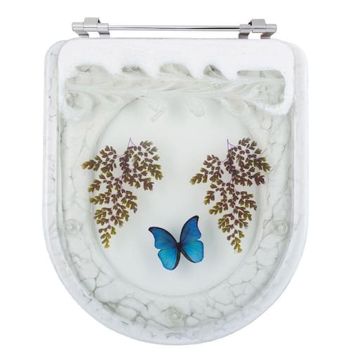Assento Sanitário Decorado Calypso Com Borboleta Azul Para Vaso Incepa Assento Sanitário Decorado Calypso marmorizado Branco com Borboleta Azul e Avencas é a escolha perfeita para seu banheiro. O Assento Sanitário Poliéster é considerado o melhor tipo de assentos sanitários do mercado pelo seu acabamento impecável e excelente durabilidade. Este assento de vaso sanitário Calypso cor Branco é produzido em resina maciça de poliéster. O poliéster é uma resina semelhante ao acrílico, só que mais robusta / resistente. Por isso, é totalmente impermeável, pode ser lavado com água à vontade. Fácil de limpar. Não acumula sujeira.